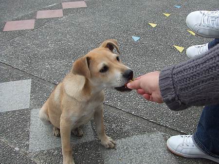 而且很乖~慢慢等著吃,不會咬到Eva餵他的手....